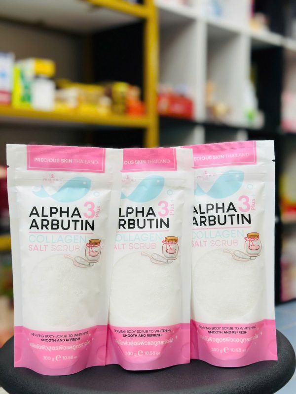 Tẩy tế bào chết muối Alpha Arbutin 3+ Plus Collagen của Precious Skin Alpha Arbutin Salt Scrub giúp làn da cơ thể trở nên tươi sáng, loại bỏ bụi bẩn tắc nghẽn trong lỗ chân lông, tẩy tế bào chết và mang lại làn da sáng mịn.